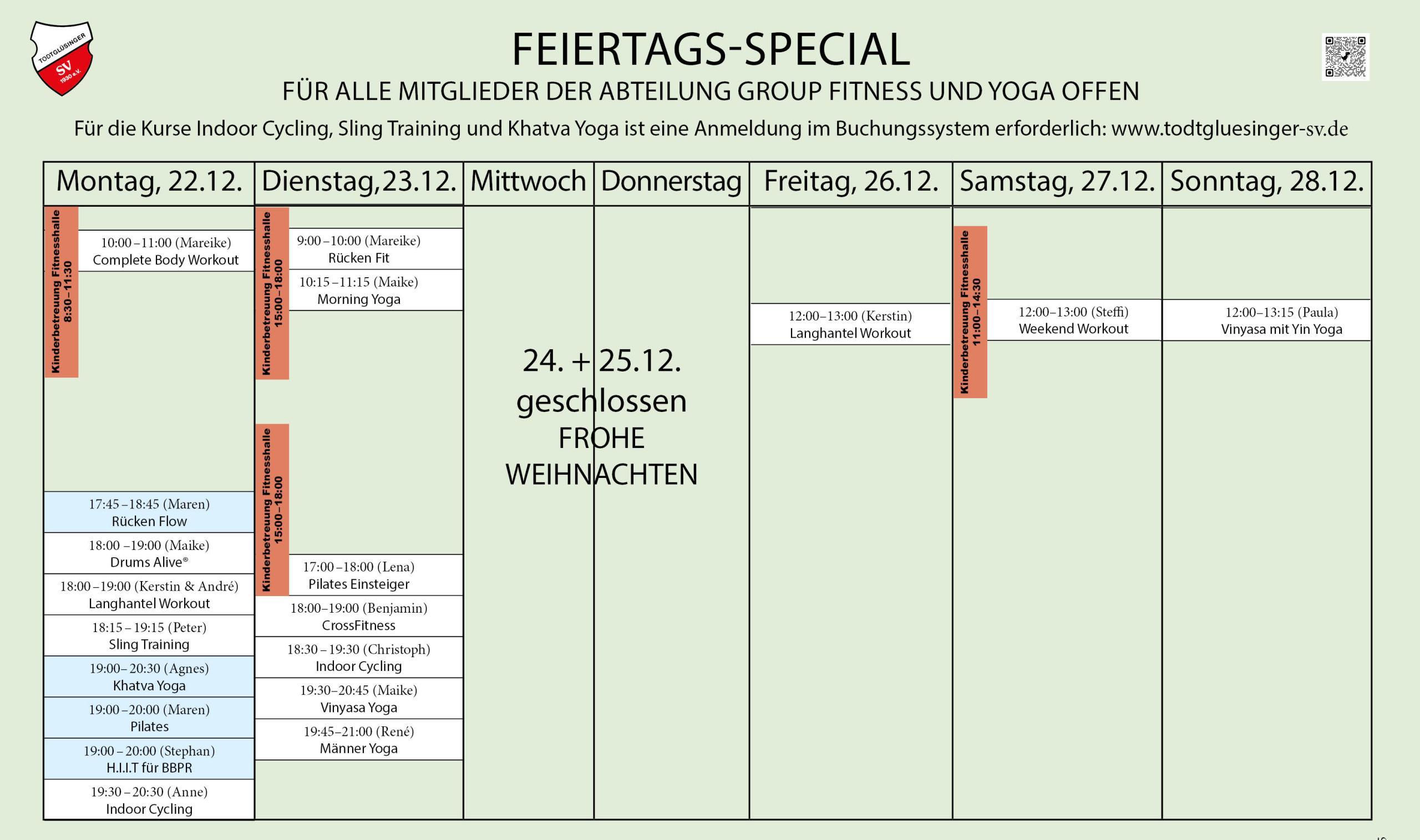 In diesem Jahr bieten wir euch eine kleine Besonderheit rund um die kommenden Feiertage. Für alle Mitglieder der Sparten Group Fitness und Yoga gibt es einen gemeinsamen Kursplan. Vom 22.12.25 bis zum 4.1.26 könnt ihr alle Kurse beider Sparten besuchen. Nutzt es gerne, um mal in andere Angebote reinzuschnuppern. Wir haben doch so viel Auswahl. Und wenn es euch gefällt: Eine Erweiterung der Mitgliedschaft um eine weitere Sparte ist gar nicht teuer. Wer interessiert, aber noch [weiterlesen]